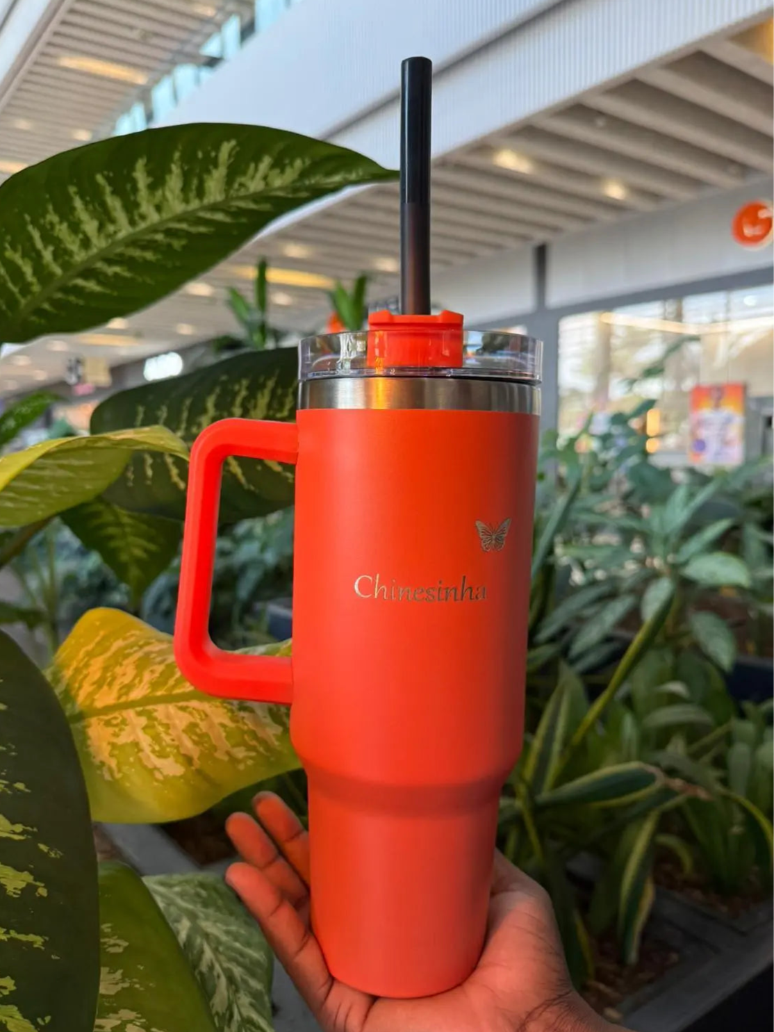 O design inclui uma alça robusta para fácil transporte e uma tampa com abertura para canudo, garantindo praticidade e evitando vazamentos. A superfície lisa e o grande espaço são perfeitos para personalização, como a gravação "Chinesinha" visível na imagem.