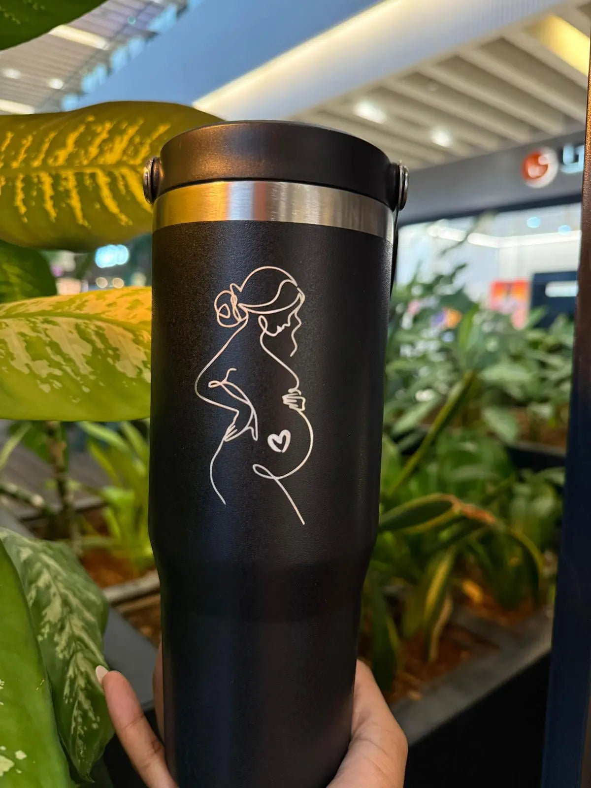Celebre a jornada da maternidade com este Copo Térmico Personalizado, um presente perfeito para futuras mamães. Com um design elegante e uma gravação artística de uma gestante, este copo é uma forma carinhosa de acompanhar a rotina de quem espera um bebê.